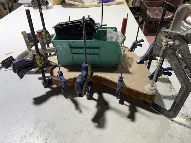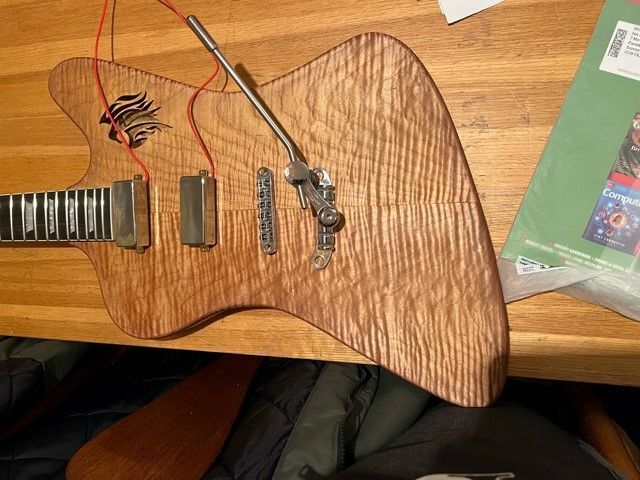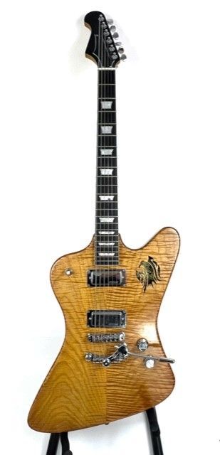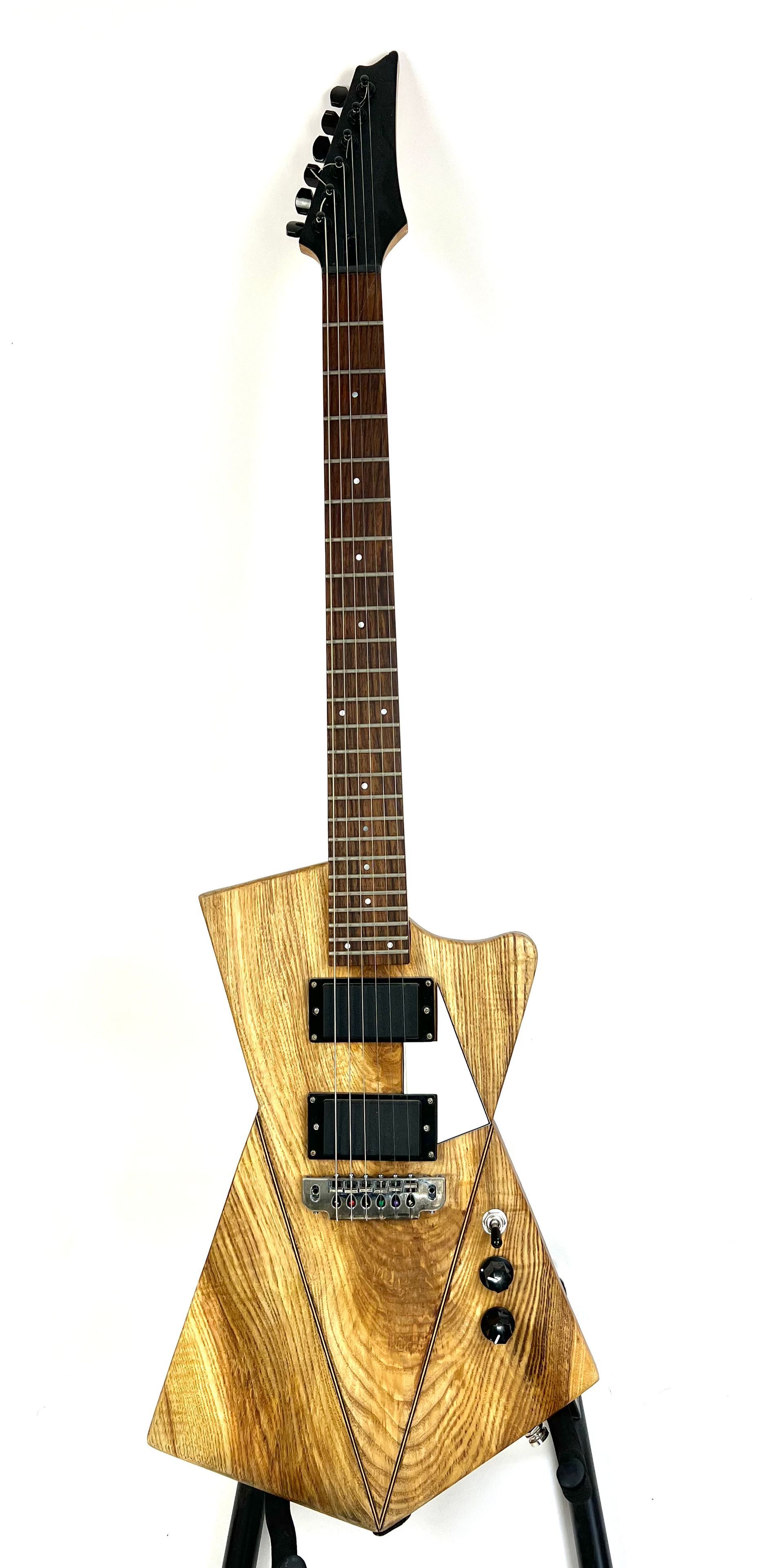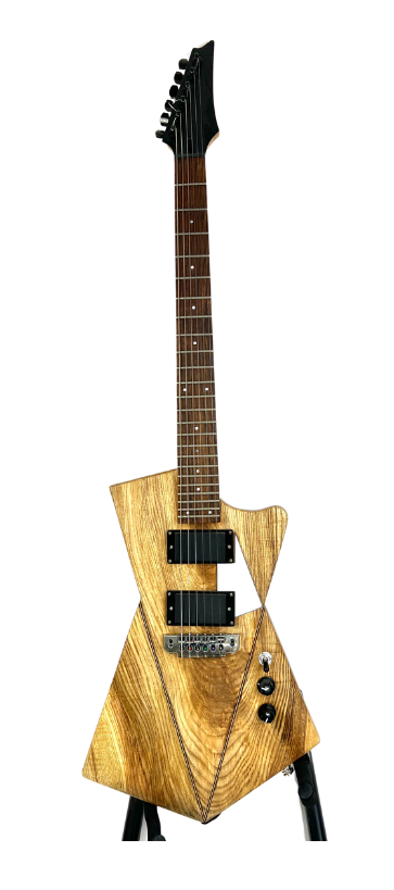 Recycled one piece inlaid solid Ash. Ibanez 5 piece Maple neck, 25.5" scale, Gibson Humbucker pickups.