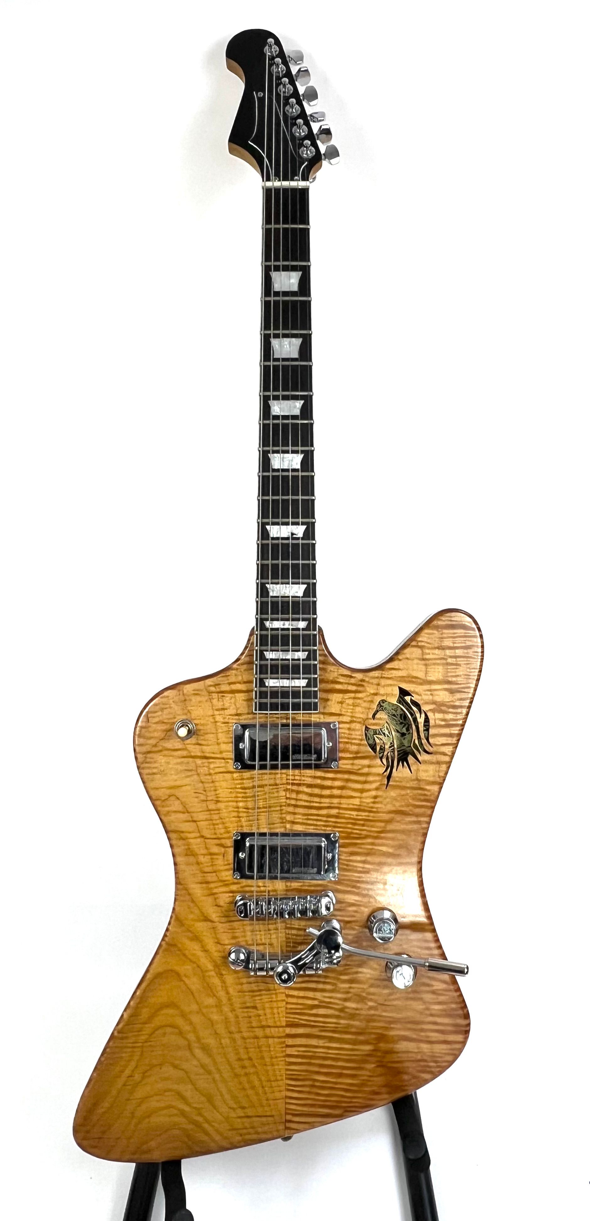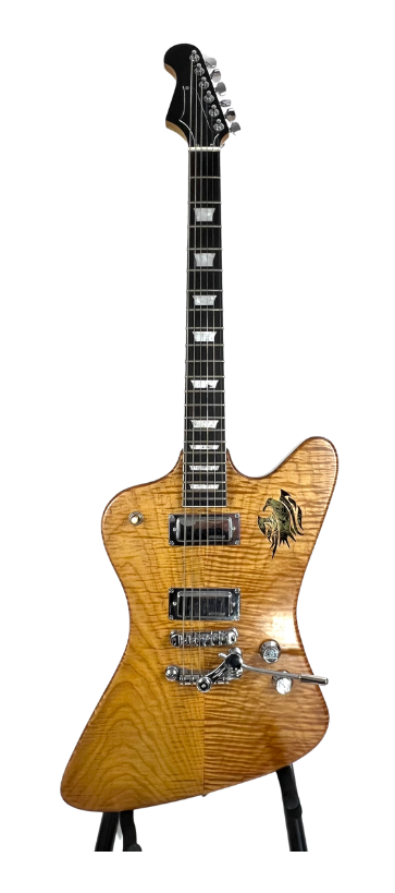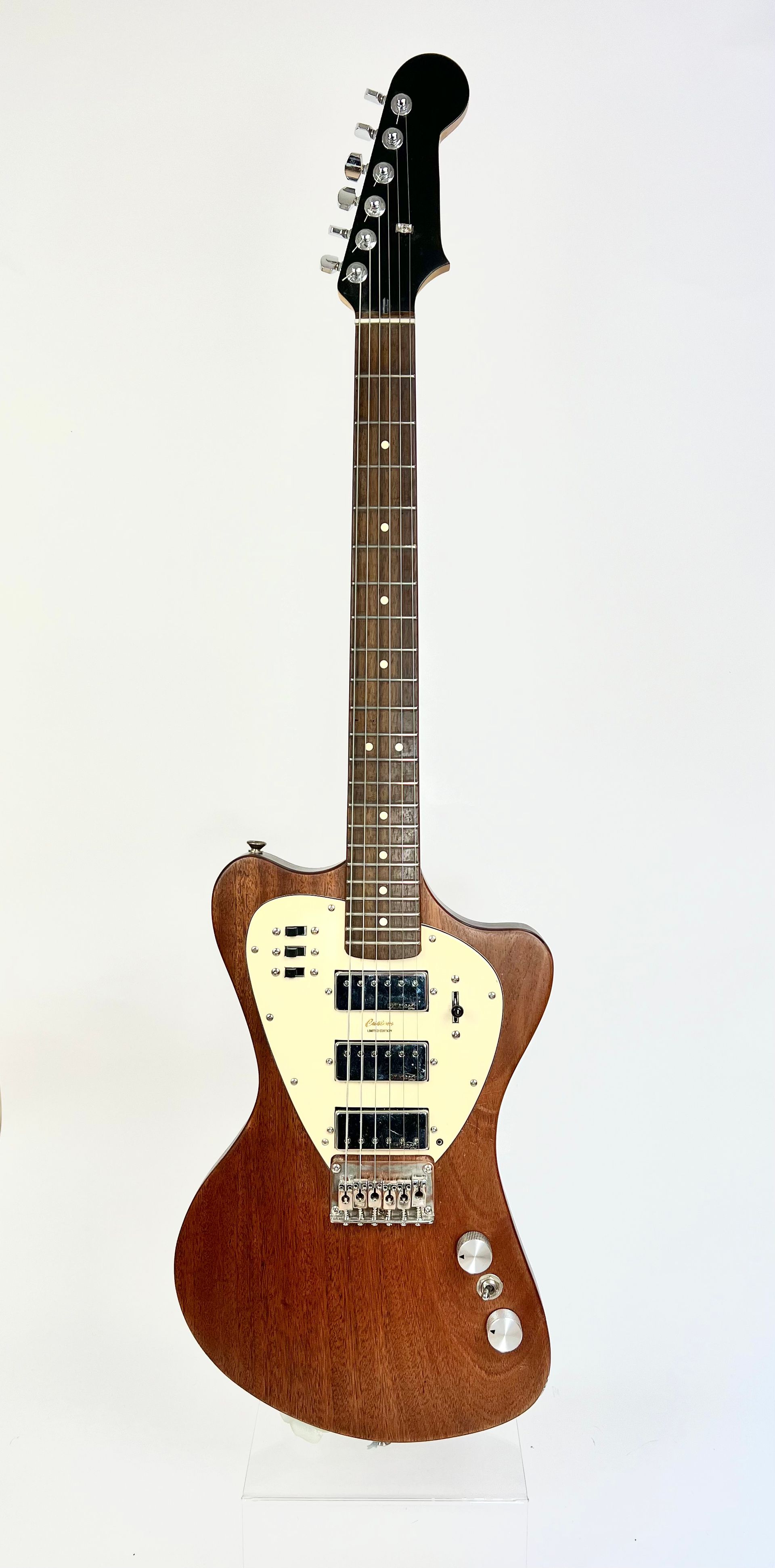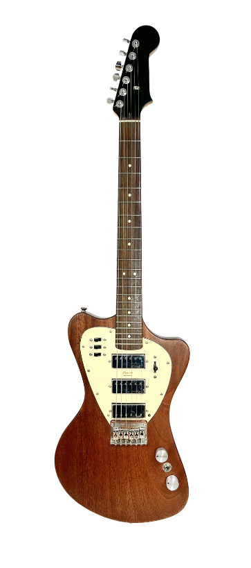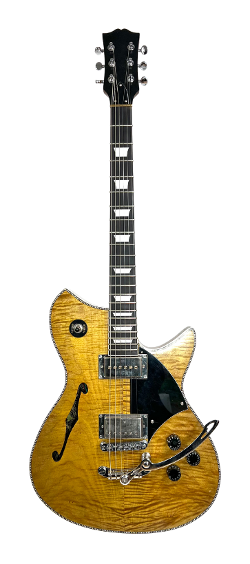 Recycled one piece chambered Mahogany body with book-matched Maple cap, Lazer cut sound hole, 24.5" Maple neck, Wilkinson Mini Humbucker pickups, Roller Bridge with Deusenburg Trem